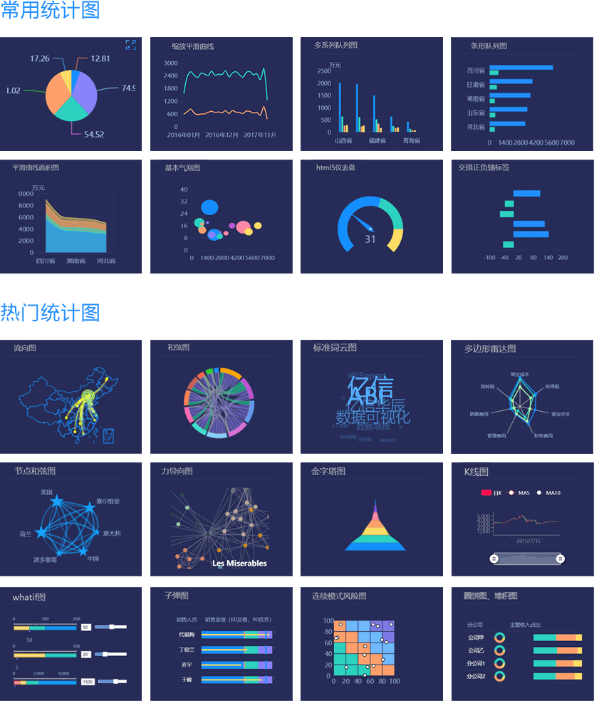ABI采用JS、FLASH、HTML5三種技術自主開發(fā)統計圖,豐富的統計圖保證了其具有美觀的圖形展現能力,除了常用的柱狀圖、線狀圖、條形圖、面積圖、餅圖、點圖、儀表盤、走勢圖外,還支持和弦圖、圈餅圖、金字塔、漏斗圖、K線圖、關系圖、網絡圖、玫瑰圖、帕累托圖、數學公式圖、預測曲線圖、正態(tài)分布圖、迷你圖等,樣式包括2D、3D、EXCEL、AUTUMN、FLASH等;通過組合設計可以搭配處上千種視覺效果。