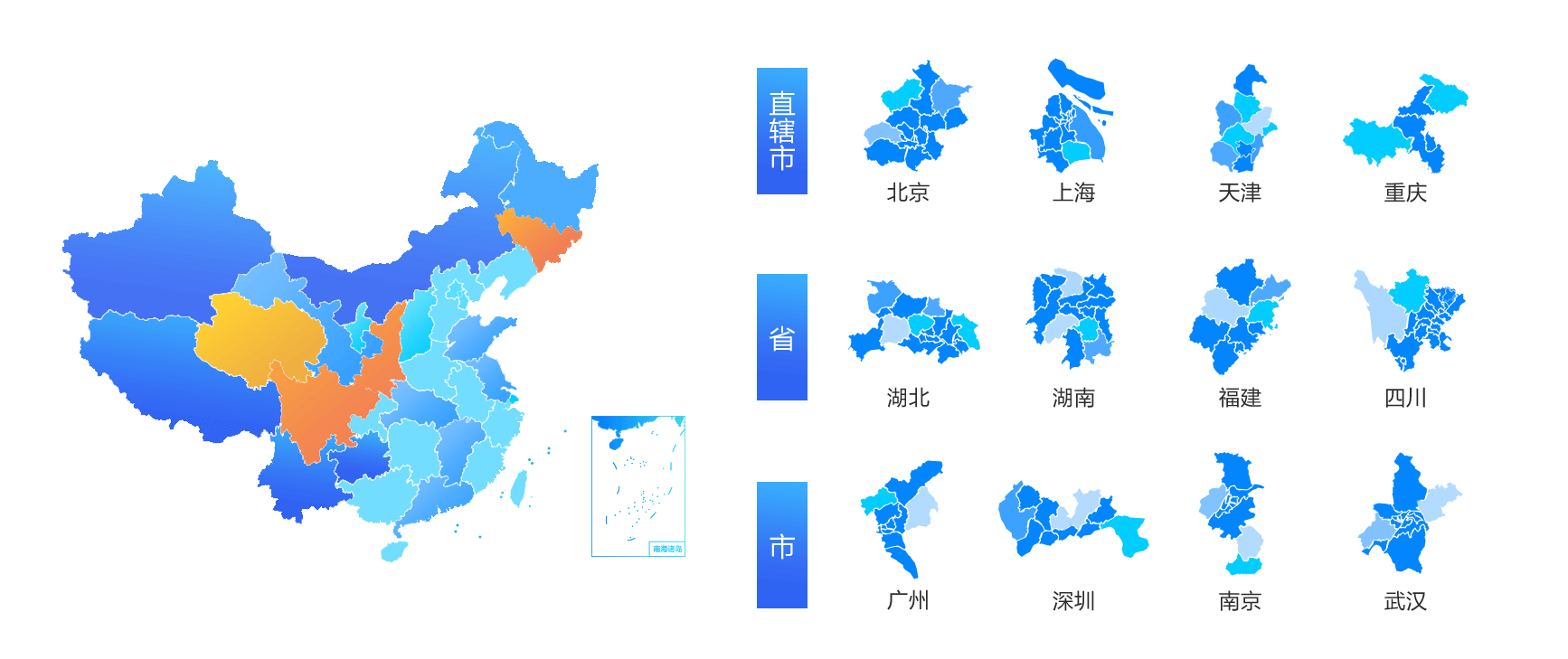 內置五大洲及世界地圖、中國地圖,囊括中國34個省239個市區(qū)縣的地圖,地圖類型包塊FLASH、圖片和HTML5格式,同時支持個性化定制地圖。