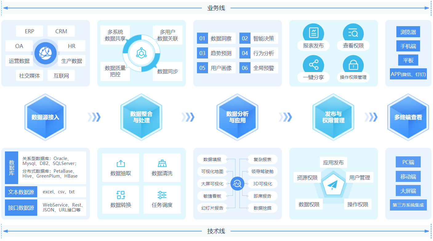 ABI(ALL in one BI)是億信華辰深耕商業智能領域十多年,在豐富的數據分析挖掘、報表應用等經驗基礎上,自主研發的一款融合了ETL數據處理、數據建模、指標管理、數據可視化、數據分析、數據填報、移動應用等核心功能而打造的全能型數據分析平臺。